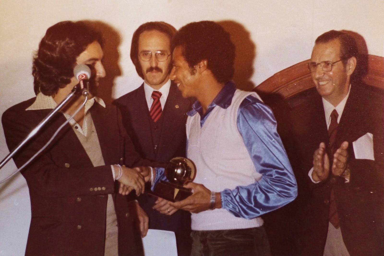 Galvão Bueno entrega o troféu Bola de Ouro ao centroavante Mirandinha da Caldense. O repórter Eduardo Paiva e o narrador Lázaro Walter Alvisi, ambos da Rádio Cultura, acompanham o momento. (Foto cedida gentilmente por Ricardo Alvisi, filho de Lólo).