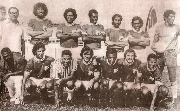 Em pé: diretor Dr. Antonio Megale, Buzuca, Luis Pedro, Neto, Hildo, Luiz Carlos Beleza e Tonho. Agachados: massagista Rosa, Serginho, GARRINCHA, Lelo, Carlos Roberto, Ailton Lira e Ganzepe.