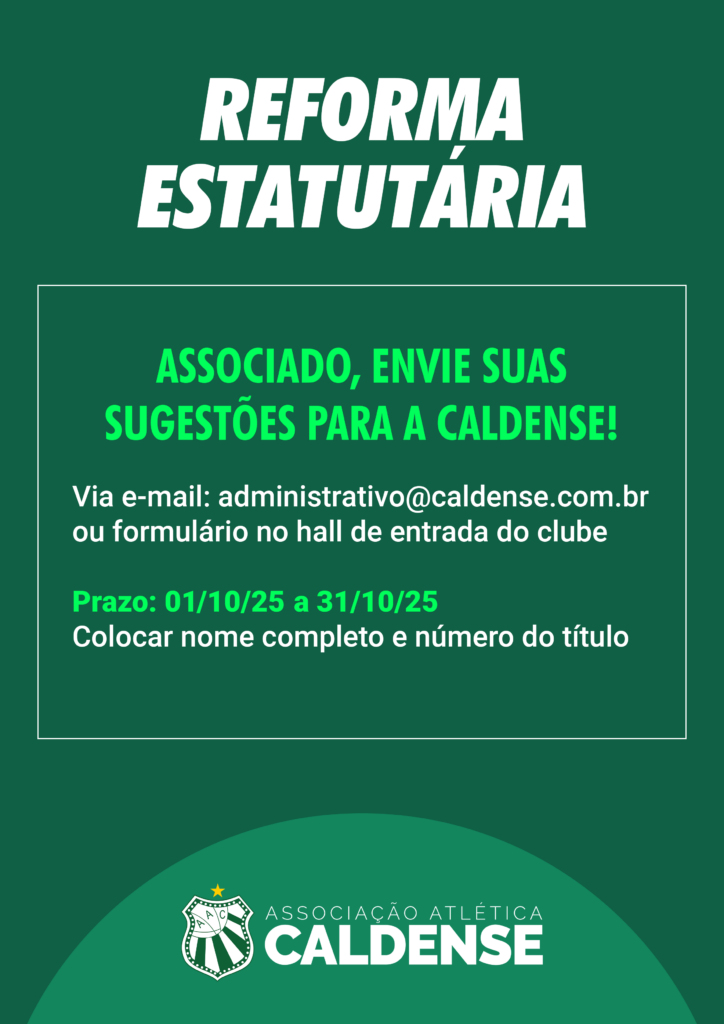 Os associados do clube podem participar enviando sugestões para o novo estatuto da Caldense. Seja presencialmente na sede social do clube em um espaço montado no hall de entrada do clube, via preenchimento de formulário, ou pelo e-mail administrativo@caldense.com.br. Os associados devem enviar suas sugestões no prazo de 01 de outubro a 31 de outubro de 2025, apresentando nome completo e número do título.